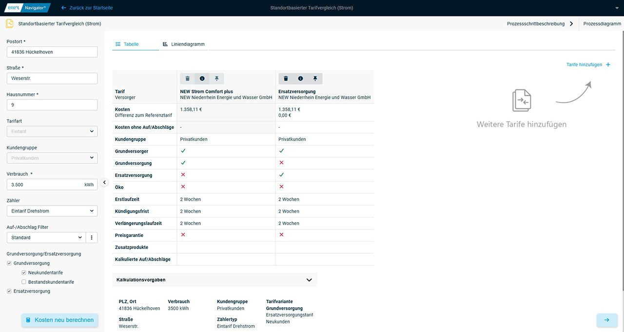Gewünsch­te Tari­fe von ver­schie­dens­ten Ver­sor­gungs­un­ter­neh­men las­sen sich in den Ver­gleich auf­neh­men. Bei der Kos­ten­be­rech­nung wer­den für die Son­der­ta­ri­fe alle zu den gewähl­ten Abschlags­ty­pen und Vor­aus­set­zun­gen pas­sen­den Abschlä­ge ein­be­rech­net. Zusätz­lich wird die preis­li­che Dif­fe­renz der ein­zel­nen Tari­fe zu einem gewähl­ten Refe­renz­ta­rif ausgegeben.